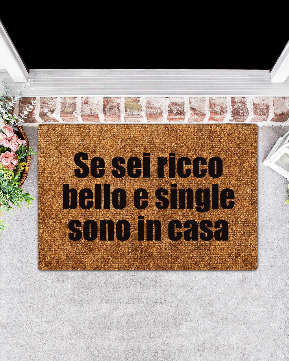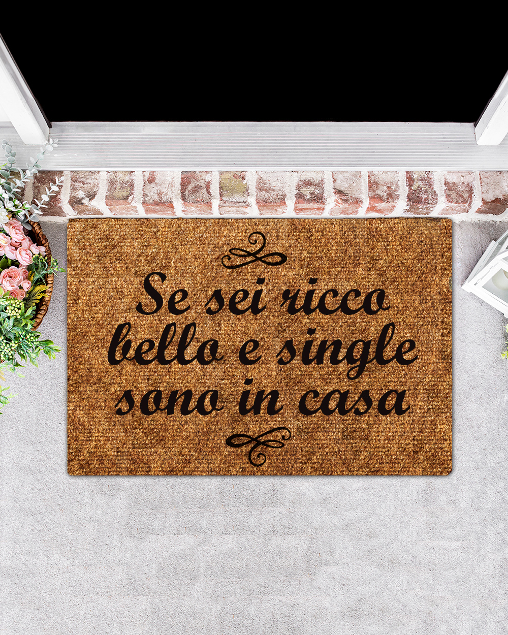 Stai cercando un’idea regalo unica e spiritosa per un’amica o una coppia di amici che va a convivere? Oppure vuoi semplicemente dare un tocco di originalità alla tua casa? Il nostro Zerbino Divertente Personalizzato con la scritta “Se Sei Ricco Bello e Single Sono In Casa” è la scelta ideale! Non solo farà sorridere chiunque entri, ma è anche pratico e di alta qualità.