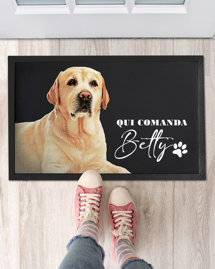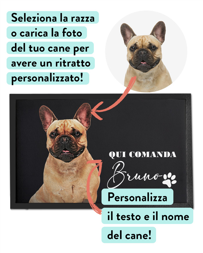 Lo zerbino può essere personalizzando indicando la razza del tuo cane, che utilizzeremo per realizzare il ritratto da stampare; se invece desideri un risultato ancor più personalizzato, puoi caricare la foto del tuo cane e realizzeremo il ritratto del cane a partire proprio dalla tua foto.
