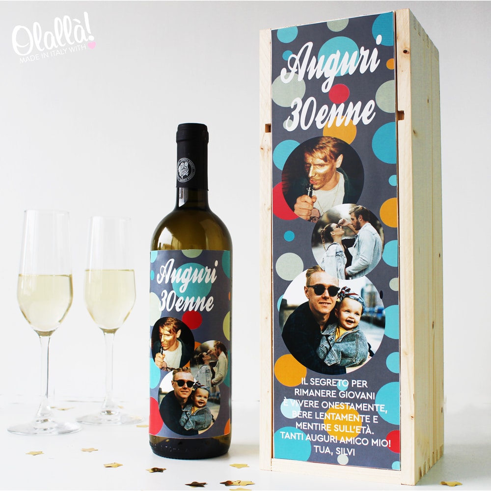 Splendida cassettina porta vino personalizzata con una foto e dedica con sfondo a bolle colorate. Una fantastica idea regalo per celebrare con un brindisi un compleanno importante. Aggiungi una bottiglia dei nostri vini personalizzando l’etichetta ed il gioco è fatto, in pochissimi giorni il tuo regalo sarà consegnato!