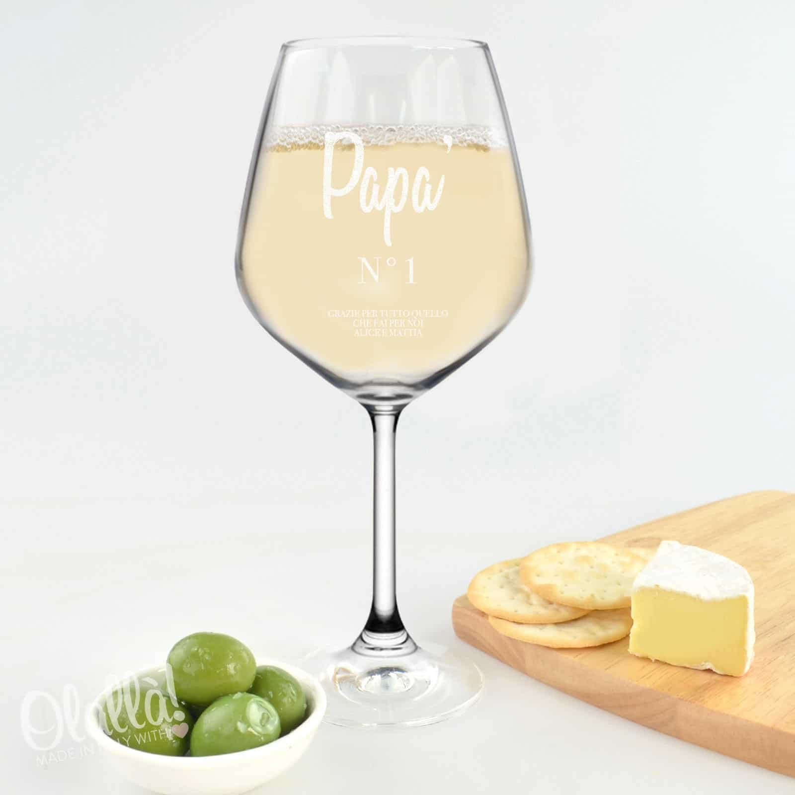 Splendido calice di alta qualità made in Italy con la scritta “Papà N°1” e una vostra dedica personalizzata. Ideale come regalo per il vostro papà del cuore, in occasione della Festa del Papà o per il suo compleanno. Fategli sapere quanto gli volete bene con questo regalo unico!