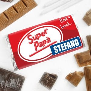 Divertente barretta di cioccolato personalizzata con le scritte “Have a break”, “Super Papà” e il nome del festeggiato. E’ possibile anche aggiungere una breve dedica sul retro. Ideale come regalo per il vostro supereroe di casa per la Festa del Papà. Emozionate il vostro papà speciale nel modo più dolce che ci sia!