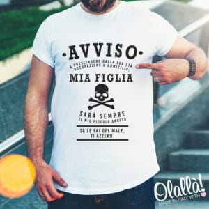 Simpaticissima maglietta con scritta che mette in guardia i potenziali interessati alla propria figlia. Ideale per prendere un po’ in giro il papà un po’ geloso di una bambina o ragazza.