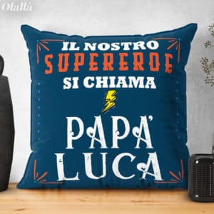 Meraviglioso cuscino personalizzabile con il nome e la dedica che desideri. Il regalo perfetto per rendere felice il tuo super papà nel giorno della sua festa, del suo compleanno o per qualsiasi occasione speciale!