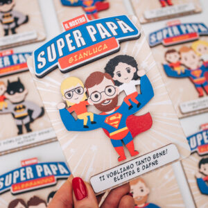 Un regalo perfetto per gli amanti dei supereroi, che potranno identificarsi nel simpatico supereroe di questa targhetta che tiene sulle spalle i suoi bimbi. Stupisci il tuo papà questo 19 Marzo con questo regalo originale e alternativo per la festa del Papà!