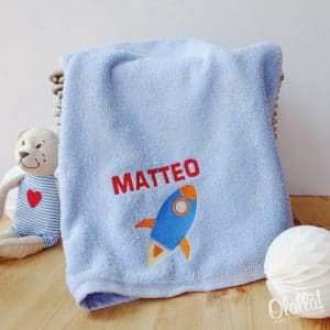 Simpatico asciugamanino personalizzato con il nome del bambino e il ricamo di un razzo lanciato verso lo spazio. Pensato per i vostri piccoli futuri astronauti, per accompagnarli con allegria alla scuola materna!