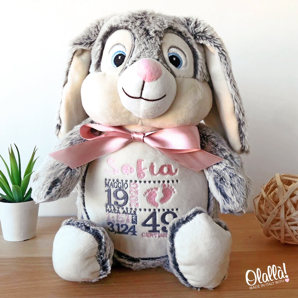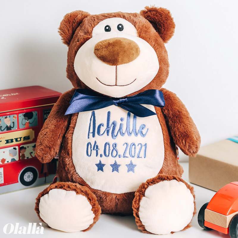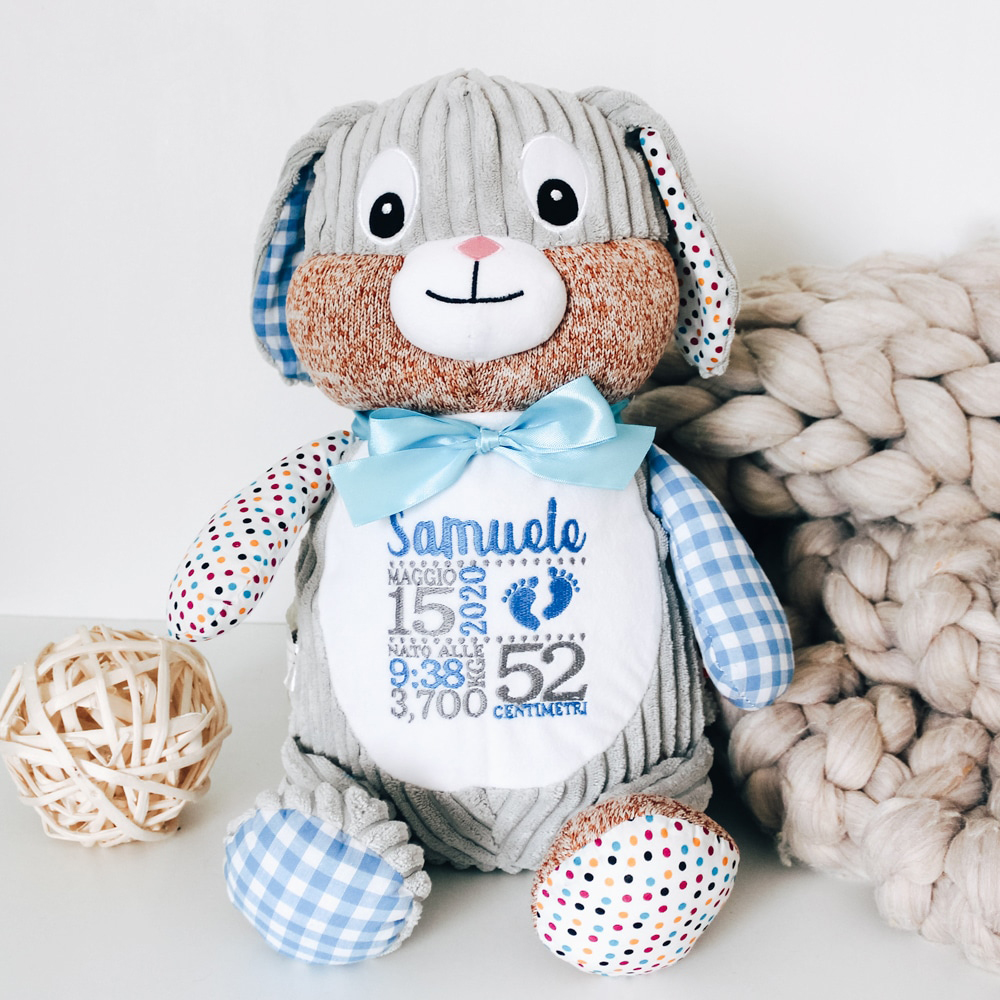 Tenerissimo peluche personalizzato con il ricamo del nome e della data di nascita sul pancino. Un’idea regalo originale per celebrare l’arrivo di un nuovo bebè o un battesimo. Ricamo a scelta in versione da femminuccia o maschietto.