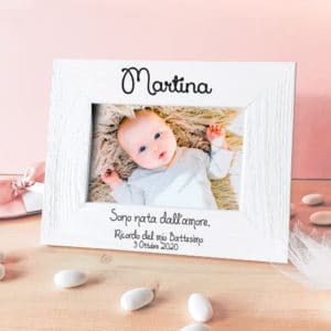 - La bellissima cornice personalizzata con il nome e la data di nascita della bambina! All’interno potrete inserire la fotografia della piccola e farle un regalo che resterà nel tempo.