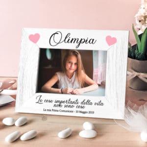 Cornice in legno realizzata artigianalmente in Italia e personalizzata con nome frase e cuoricini. Fai un regalo di comunione o battesimo davvero speciale al tuo bimbo del cuore o regalala al padrino e madrina per fare un dono davvero indimenticabile.
