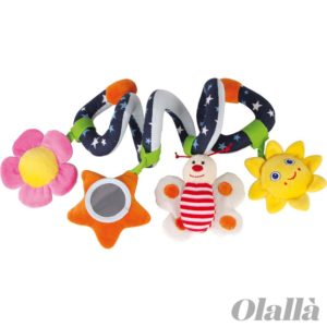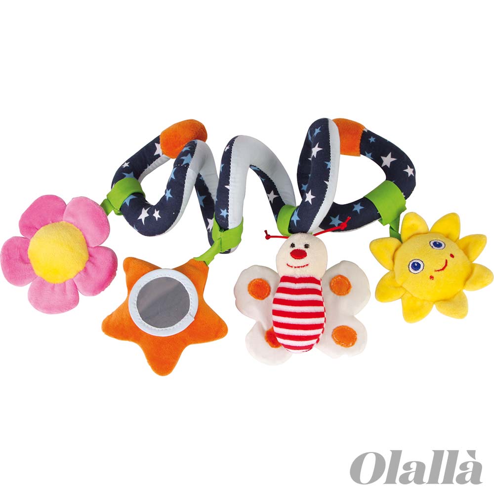 Ad una spirale di stoffa vi sono applicati diversi motivi morbidi e colorati che con il loro crepitio, il loro sbattere, lo squittire e con fogli che riflettono l’immagine, sono atti ad attivare i riflessi e la presa dei piccoli e ad attirare la loro attenzione nei confronti del mondo circostante!