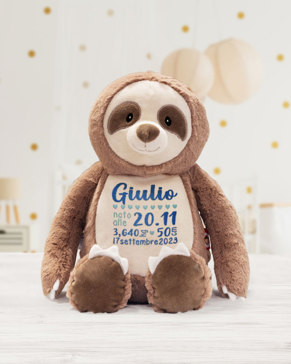 Acquista ora!Bradipo Pupazzo Peluche Personalizzato con Data di Nascita e Dati di Nascita