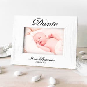 Fra gli altri regali di battesimo originali e unici troviamo l’illustrazione personalizzata con il nome del bambino e i simpatici animali, un pensiero che accompagnerà il bambino per anni, aiutandolo anche a memorizzare anzitempo la scrittura del nome. In alternativa potete optare per un album personalizzato, perfetto per custodire tutte le fotografie del nuovo arrivato in famiglia. Un’altra idea regalo speciale è la cornice personalizzata per accogliere la foto del bimbo o della bimba durante la cerimonia, oppure una targhetta in legno portasoldi dove inserire il denaro in maniera originale e inaspettata. Se vuoi fare un regalo davvero sfavillante puoi scegliere un peluche personalizzato con impresso il nome del bimbo e una dolce frase. Una memory box sarà l’ideale invece per custodire tutti i ricordi del piccolino in una sorta di “capsula del tempo”. Se preferisci fare un regalo affettuoso puoi optare per un tenero dou dou personalizzato o un palloncino in stoffa personalizzato. Anche un portachiavi in eco pelle con foto del bebè sarà un pensiero super gradito, così come un body o una salopette che il bambino potrà sfoggiare con tenerezza. In alternativa hai a disposizione un dolcissimo cuscino dove far stampare la foto del bambino e avere sempre presente un tenero ricordo del piccolino o della piccolina.