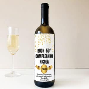 Pregiata bottiglia di vino o spumante da cantine italiane di eccellenza personalizzabile con il vostro augurio speciale, il nome del festeggiato, l’anno di nascita ed una vostra dedica. Il regalo perfetto per emozionare il vostro cinquantenne del cuore, specialmente se è un appassionato del buon vino. Festeggiate i suoi 50 anni con un brindisi speciale!